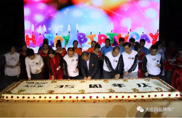 長3米5的35周年生日蛋糕推至臺前,它代表莊園35年的事業步步高升,蒸蒸日上。現場700余名員工集體合唱《生日歌》,并且大莊園全體員工為董事長準備了一棵由每一位莊園員工的指紋組成的莊園樹。“一棵樹,一家人”代表著所有莊園人在大莊園這棵大樹下吸取養分,茁壯成長。