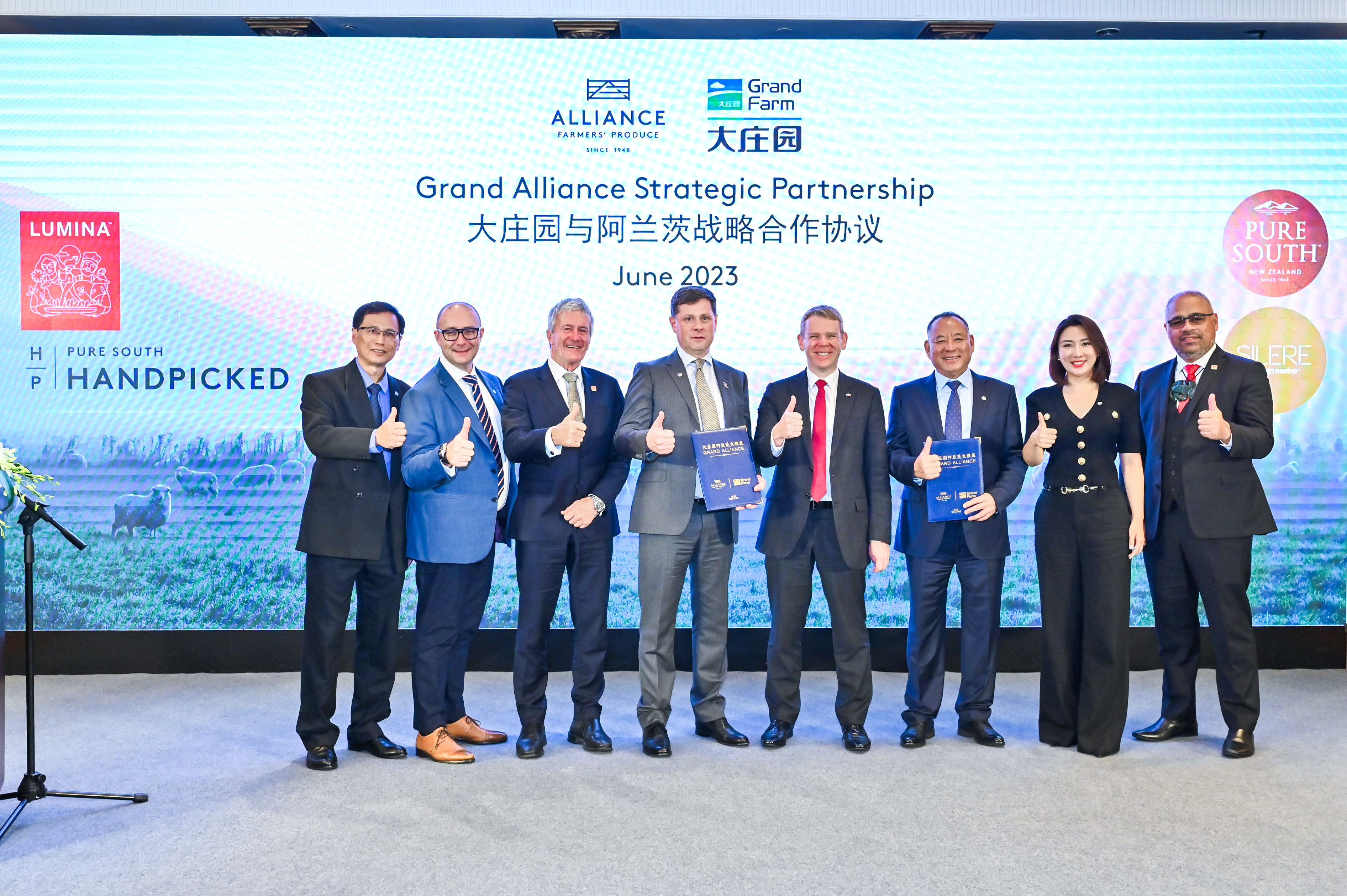 2023年6月27日,大莊園集團與新西蘭阿蘭茨集團,在新西蘭總理克里斯·希普金斯的見證下,共同簽署《大莊園與阿蘭茨戰略合作協議》,實現戰略合作全面升級。